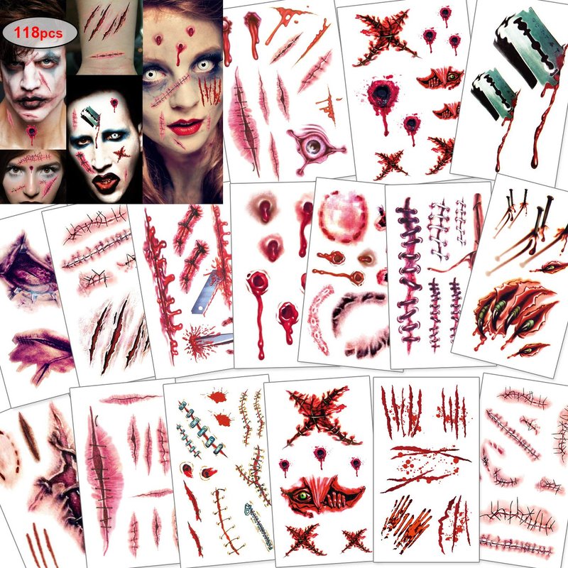 - Horrible Halloween Scars Temporary Tattoo: A set of 16 sheets Halloween tattoo stickers, every scar when sticking on the body is vivid and lifelike. Suitable for role-playing games and acting a scary role in Halloween perfectly.
