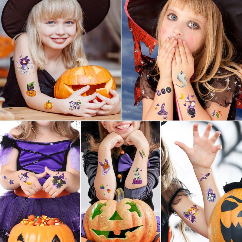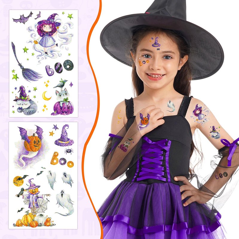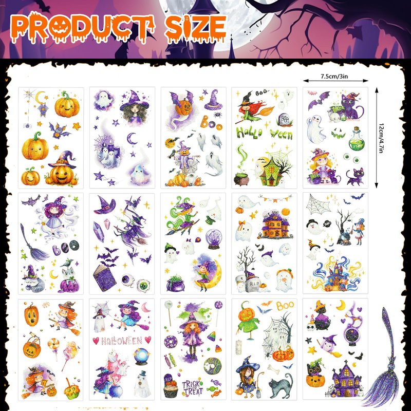 You will receive 15 sheets glitter Halloween kids tattoos temporary, each filled with holiday fun and mystery.