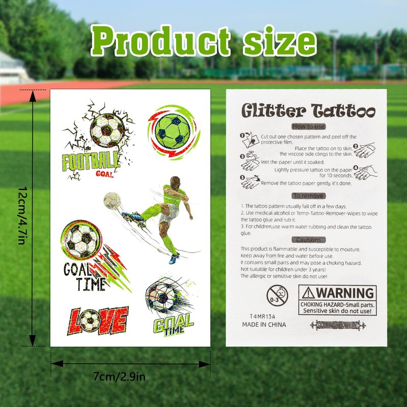 This glitter temporary tattoos is not only suitable for soccer sporting events, birthday party, holiday celebrations and other events, but also a great choice to express your passion for soccer. Both kids and adults can enjoy the fun and personality of this tattoo sticker.