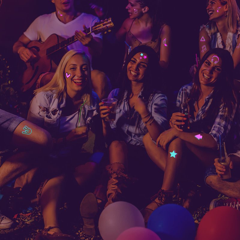 - 【20 Sheets Glow Tattoos】Glow party temporary tattoos are waterproof and long last for 3-5 days,can be used in pool and shower. Glow music themed style with vibrant colors and luminous designs,making you shine in the crowd, perfect for sharing with your friends, family or kids, these glow tattoo are the hit for your party