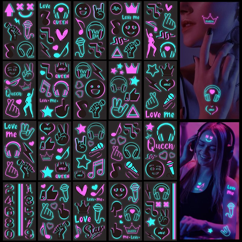 - 【Glowing in the Dark Tattoos】 Music theme glow in the dark temporary tattoos. Featuring luminous designs of star,music notes,heart-shape,crown,headphones,“Queen”and more cute pattern for woman and girls glow party favors. Perfect for GLOW theme party to create more interesting experiences and celebrate life