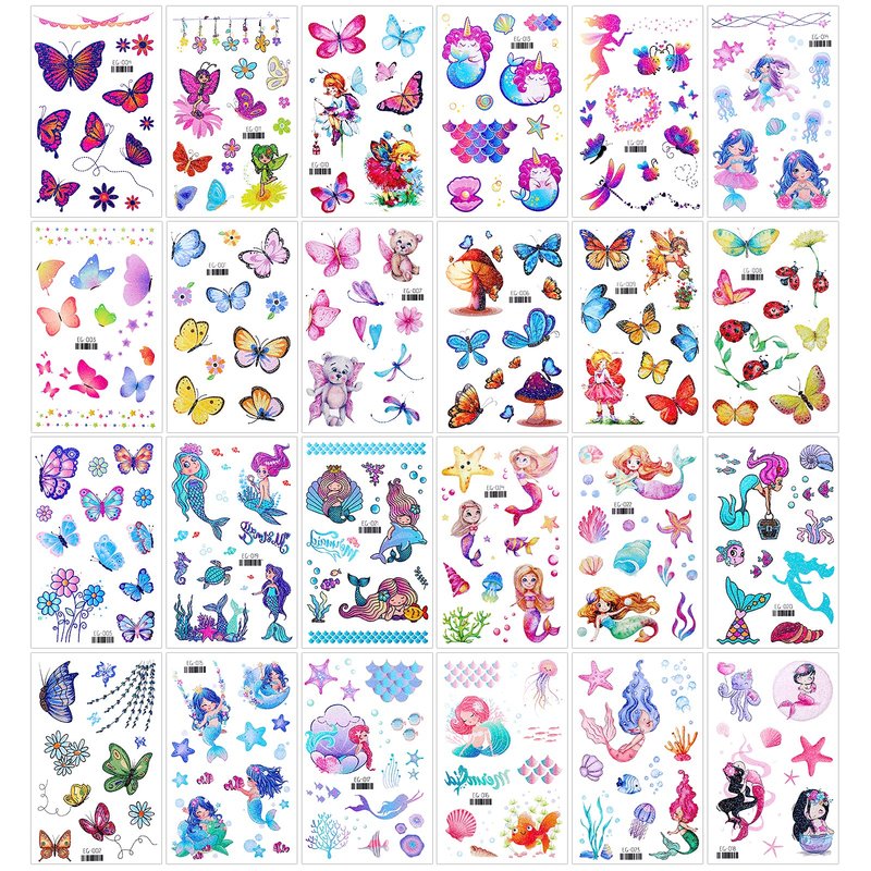 - Glitter Temporary Tattoos for Kids: 240+ Pcs temporary tattoos with sparkly glitter style, various designs tattoo stickers for girls favor, assorted butterfly, flowers, fairy, mermaid, vibrant design like hearts, dragonfly, pearl, starfish, jellyfish, Half mermaid, seaweed, shell, Treasure box more little girls favorite characters. Great fun for a butterfly theme party or spring-summer activity favors.