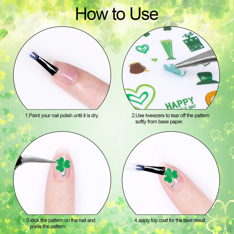 - 【Self-adhesive Nail Stickers】No water transfer. Our St. Patrick’s Day self-adhesive nail decals are suitable for the most natural or fake nails, choose the pattern you like, just peel it off with tweezers to gently stick the nails, it is better to apply polish to the primer. You can also use transparent nail polish to cover it to make the nail decals last longer. And it is easy to remove with nail polish remover.