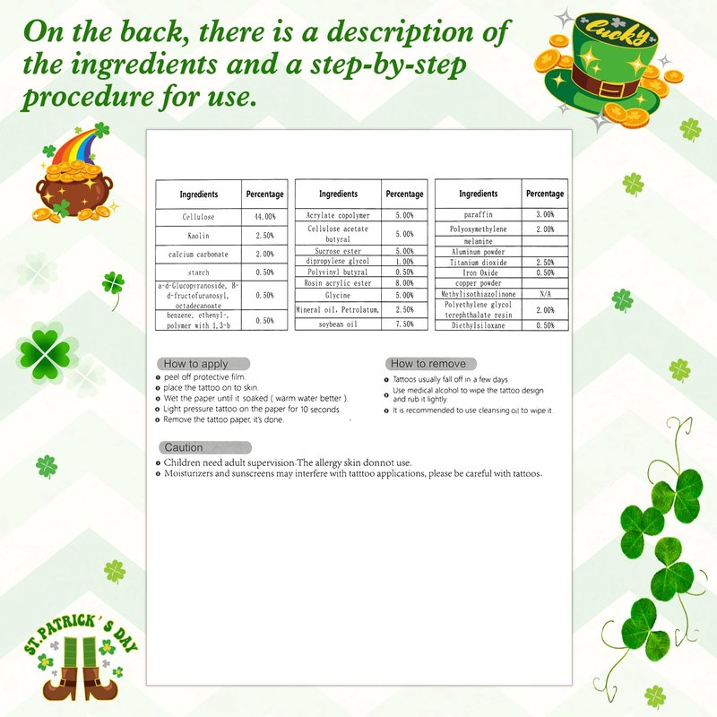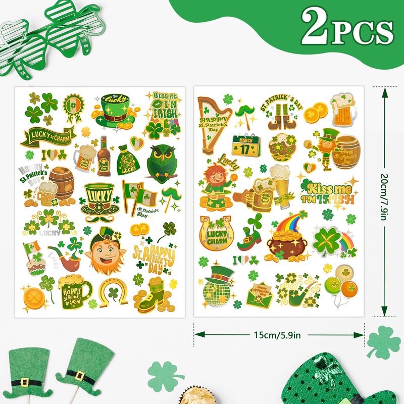 - 🍀 【 Widely Entertainment 】 We design saint Patrick's day tattoo accessories for diverse celebratory occasions, such as costume party, green-themed gatherings, family reunions and various parades and other events. Not only can be used as a gift bag filler, but also as an Irish style party accent, suitable for sticking on all parts of the body as well as other smooth surfaces, helping to create a strong festive atmosphere.