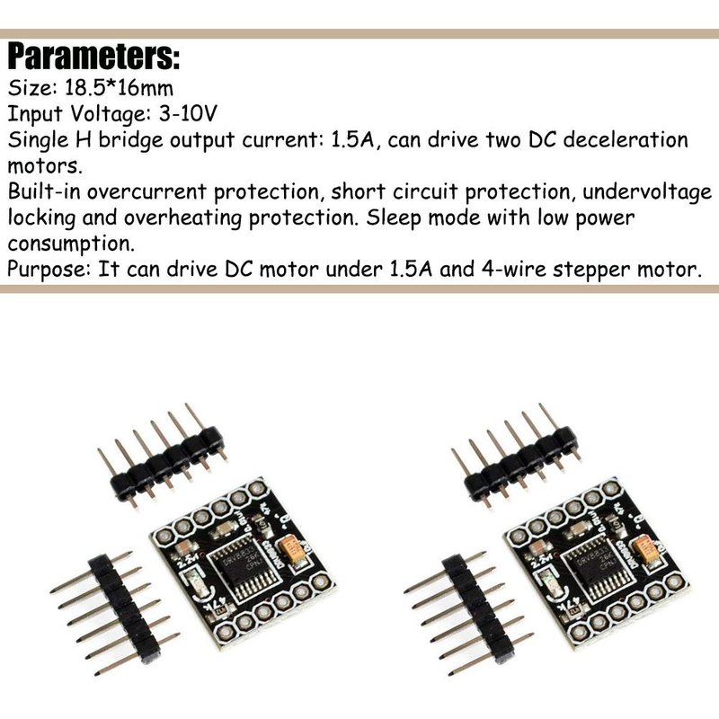 - For DIY smart car robot, it can drive DC motors up to 1.5A and 4-wire stepper motors.