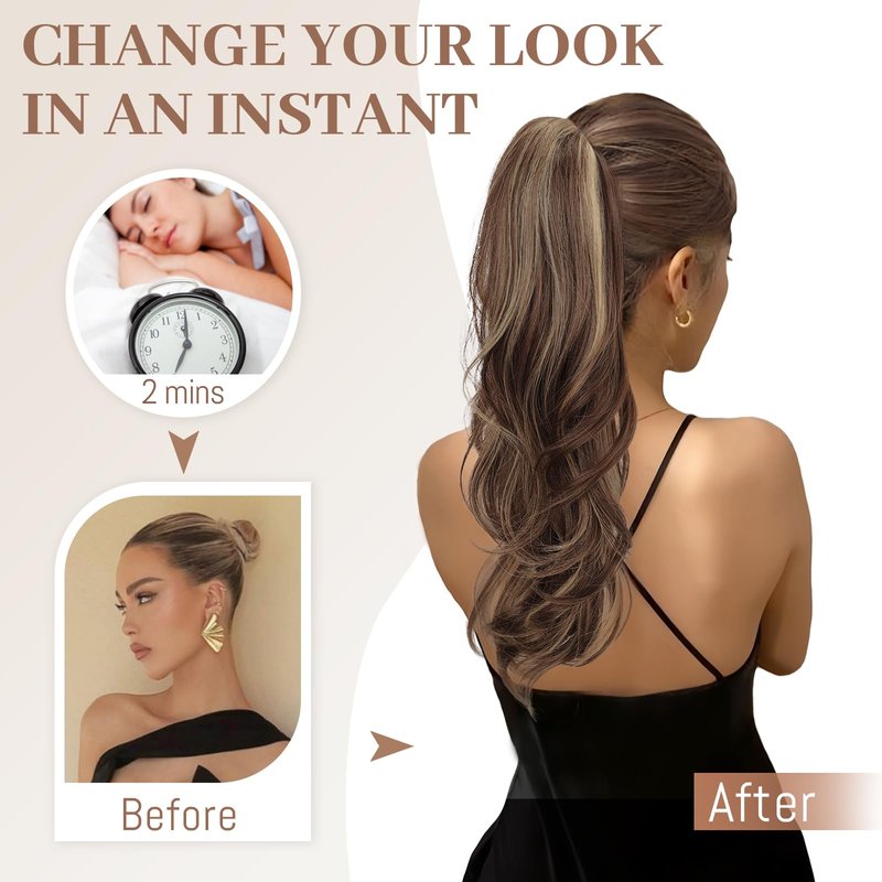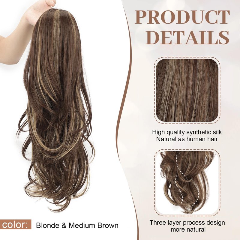 KooKaStyle Ponytail Extensions, 22 inch Long Drawstring Wavy Clip in Ponytail Hair Extensions Blonde & Medium Brown Layered Synthetic Hairpiece for Women