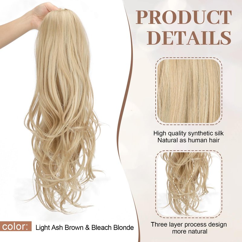 KooKaStyle Ponytail Extensions, 22 inch Long Drawstring Wavy Clip in Ponytail Hair Extensions Light Ash Brown & Bleach Blonde Layered Synthetic Hairpiece for Women