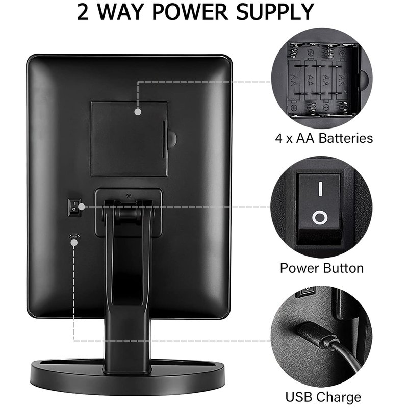- ☀Double Power Supply: USB and 4 AA batteries dual supply.(USB cable included, battery not included). Lighted makeup mirror can not store power itself.