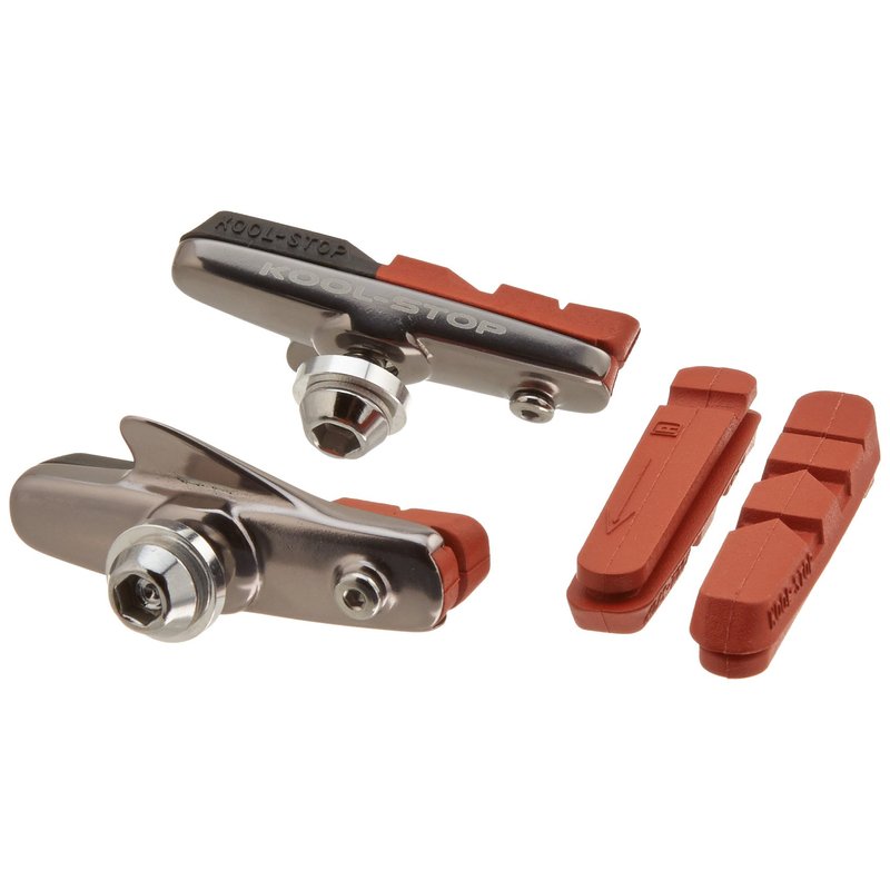 Kool Stop - Dura Road PadThe Dura Road Pad is a forged aluminum holder with dual pivot adjustment that houses our Dual Compound Dura Type insert and comes with an extra pair of our aggressive salmon compound inserts. These will fit most Shimano type brake systems.Features: Aluminum HolderPatented Plow TipWater GroovesDual Pivot AdjustmentDual CompoundExtra pair of pads Pad Compound Explanation:Black - Kool Stops standard compound which is great for all weather conditions, but designed for dry condition riding.Salmon - Kool Stops most famous Salmon compound is also one of Kool Stops most aggressive compounds for extreme all weather conditions especially in the wet, but still superb in the dry.Dual - A fusion of Kool Stops two finest compounds which will give superb braking in all weather conditions. This combination produces a more controlled smooth stop!Triple - Kool Stops triple compound is Kool Stops most aggressive compound combination for superb braking and controlled stopping in all weather conditions.Ceramic - This compound was designed for ceramic coated rims and is great in all weather conditions.Clear - is an extreme compound for only experienced trick or trails riders needing a compound that will instantly lock the wheels.