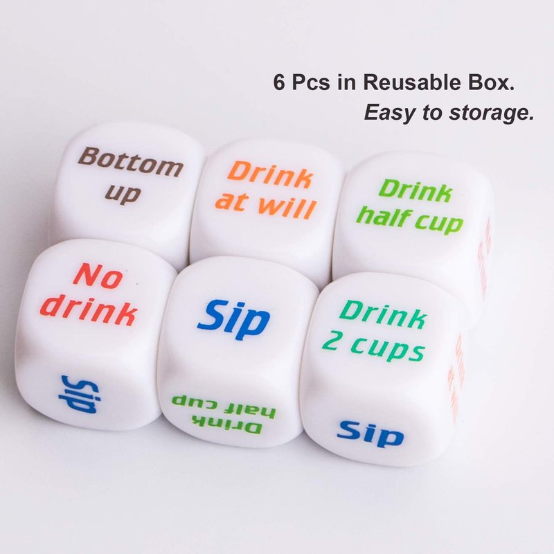 - Party drinking dice set, come with 6 pcs dices and printed with colorful words, these are not only funny but also long lasting
