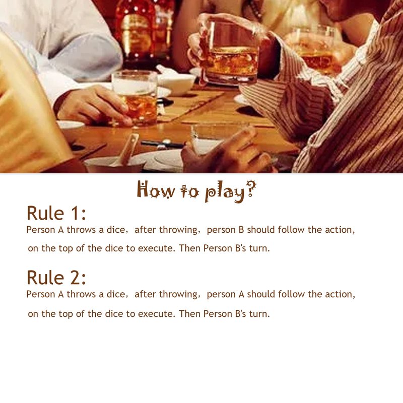 - Classic 6-sided drinking dice, include "Drink at will" "Drink half cup" "Drink 2 cups" "No drink" "Botton up" "Sip". Dice size: 2x2x2 cm/ 0.79x0.79x0.79 inch, comes with a reusable box, easy to carry