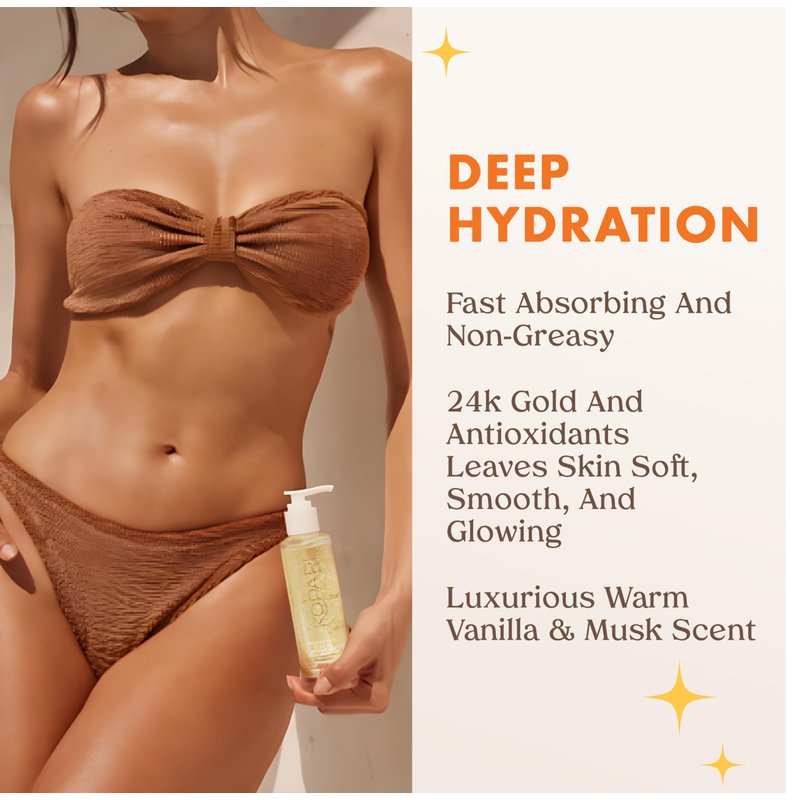 - Experience deep hydration and instant moisturization with Kopari's Golden Aura Body Oil. The intensely rich yet fast-absorbing formula features Hyaluronic Acid, 24k gold and antioxidants so skin is left soft and smooth with an irresistible glow.