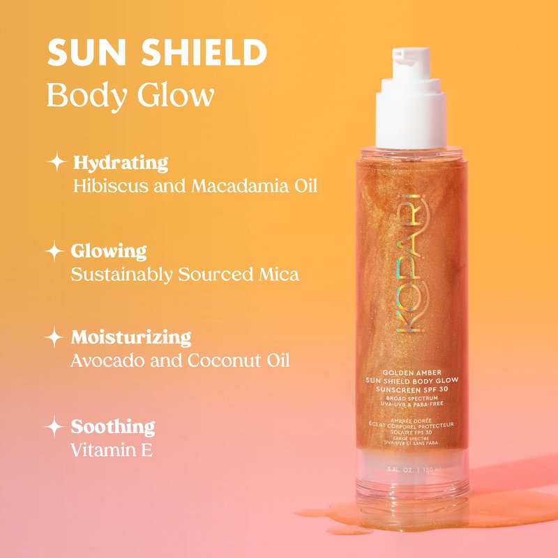 Kopari Sun Shield Body Glow - SPF 30 UV Protection Sheer Sunscreen Golden Amber - Sweat and Water Resistant - Antioxidant Vitamin E Vegan Cruelty Free - Macadamia Hibiscus Avocado Coconut Oils 5oz