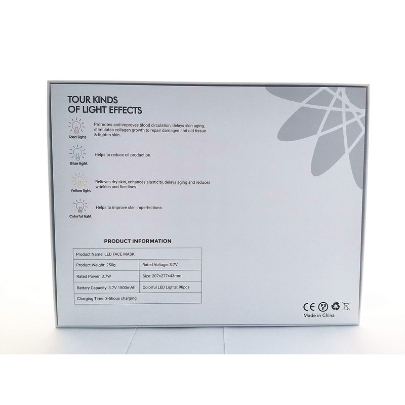 LED FACE MASK: The walking face mask made of food-grade silicone and premium fabrics, giving you a new experience. Promotes and improves blood circulation, delays skin aging, stimulates collagen growth to repair damage and old tissue & tighten skin. Helps reduce oil production. Relieves dry skin, enhances elasticity, delays aging and reduces wrinkles and fine lines. Helps to improve skin imperfections. *Made of food grade silicone *High quality fabric *Mini remote control *Tour kinds of light effects Product Weight: 250g Rated Power: 3.7W Battery Capacity: 3.7V 1500mAh Rated Voltage: 3.7V Size: 207x277x43mm Colorful LED Lights: 90pcs Charging Time: 3-5 hours charging