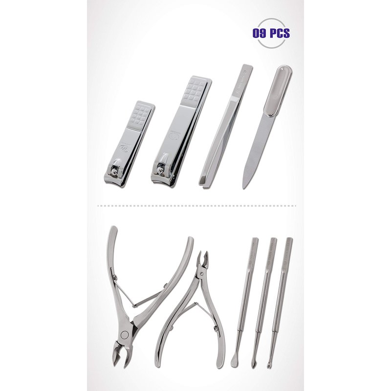 - Included (Total 9 Pcs: Nail Nippers, Cuticle Nippers, Toe Nail Clipper, Finger Nail Clipper, Tweezers, File, V-Shaped Push Stick, Cuticle & Nail Polish Pusher, Double-sided Push Stick: TS-274AP-KRKR).