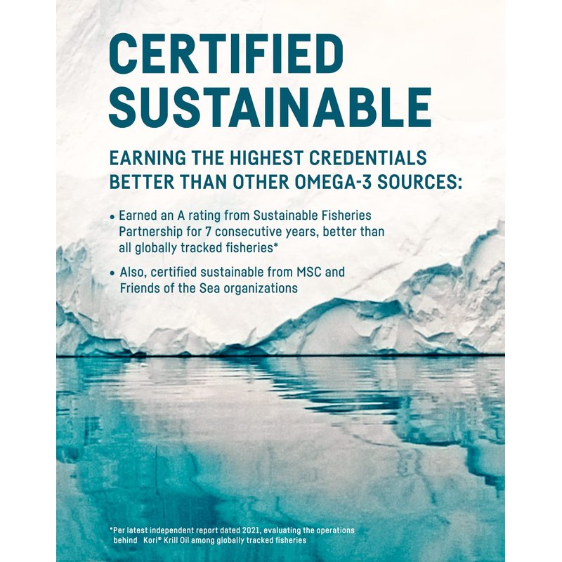 Kori Krill Oil is the Ocean's Superior Omega with more nutrients in their most natural form for your best whole-body health. Krill Oil Omega-3s provide multi-benefit support for heart, cardiovascular, brain, joint, eye, skin, imune, and whole body health. Krill Oil Omega-3s contain phospholipids our bodies prefer for superior absorption and bioavailbility versus fish oils, algae oils, and flaxseed oil supplements. Kori krill oil has no fish aftertaste or fishy burps. Sustainably sourced from pristine Antartica, the operations behind Kori Krill Oil has earned the highest sustainability credentials and is MSC certified. One softgel a day provides 140mg of EPA and DHA Omega-3s.