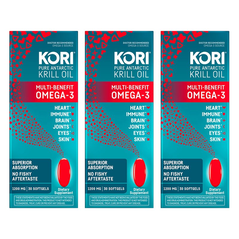 Kori Krill Antarctic Krill Oil Omega 3 Supplement, EPA & DHA, Krill Oil Supplements with Superior Absorption vs. Fish Oil, 1200 mg, 30 softgels (Pack of 3)