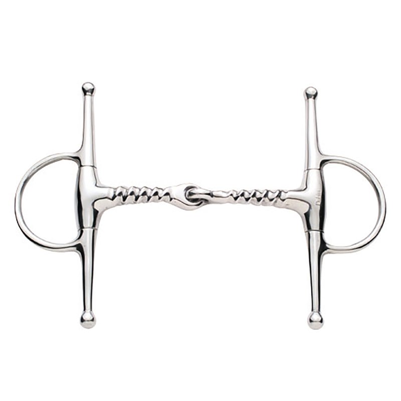The full cheek snaffle has narrow arms which project above and below the rings, preventing the mouthpiece from sliding in the horses mouth and to emphasize the tuning aid. The corkscrew design puts pressure on the tongue, bars, lips and palate, offering more control over stronger horses. The single joint applies a nut cracker action which applies pressure to the tongue, the bars of the mouth and the horse's palate.
