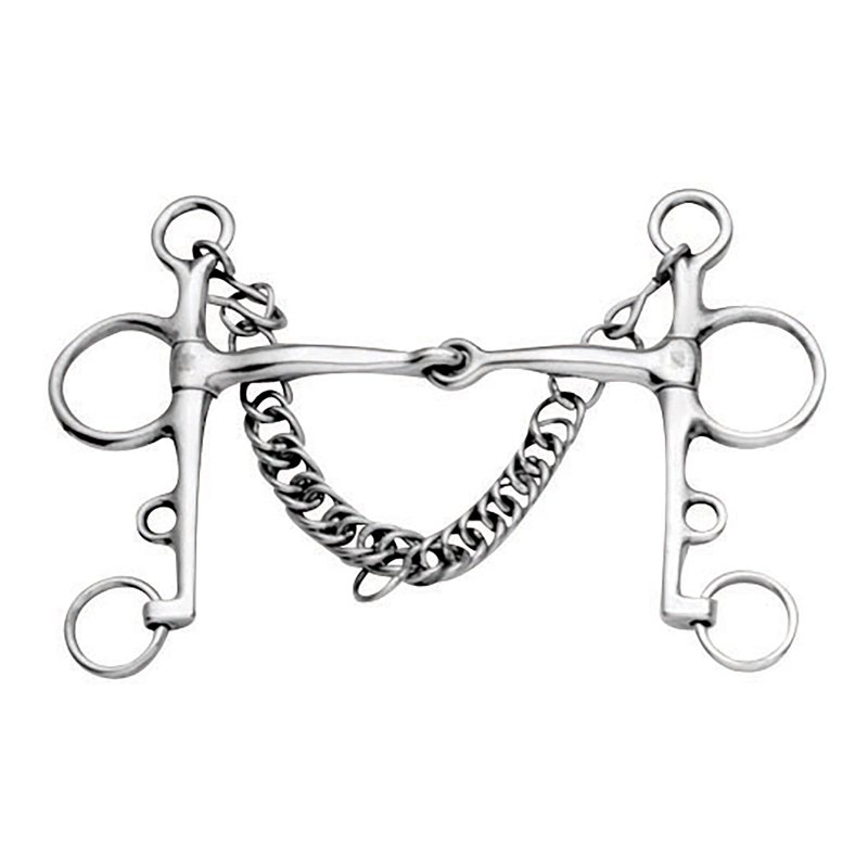 The Pelham bit combines the function of a snaffle and the action of a curb bit. The top rein provides snaffle pressure to the tongue and corners of the mouth, while the bottom rein increases leverage and curb chain pressure. The single joint applies a nut cracker action which applies pressure to the tongue, the bars of the mouth and the horse's palate.