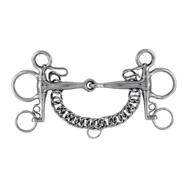 The Pelham bit combines the function of a snaffle and the action of a curb bit. The top rein provides snaffle pressure to the tongue and corners of the mouth, while the bottom rein increases leverage and curb chain pressure. The Tom Thumb cheeks are shorter than on a traditional pelham making this a better bit for a less experienced rider due to the reduced curb action available. The single joint applies a nut cracker action which applies pressure to the tongue, the bars of the mouth and the horse's palate.