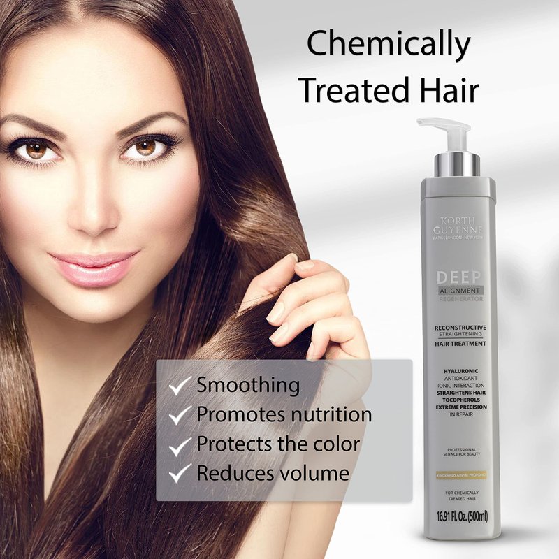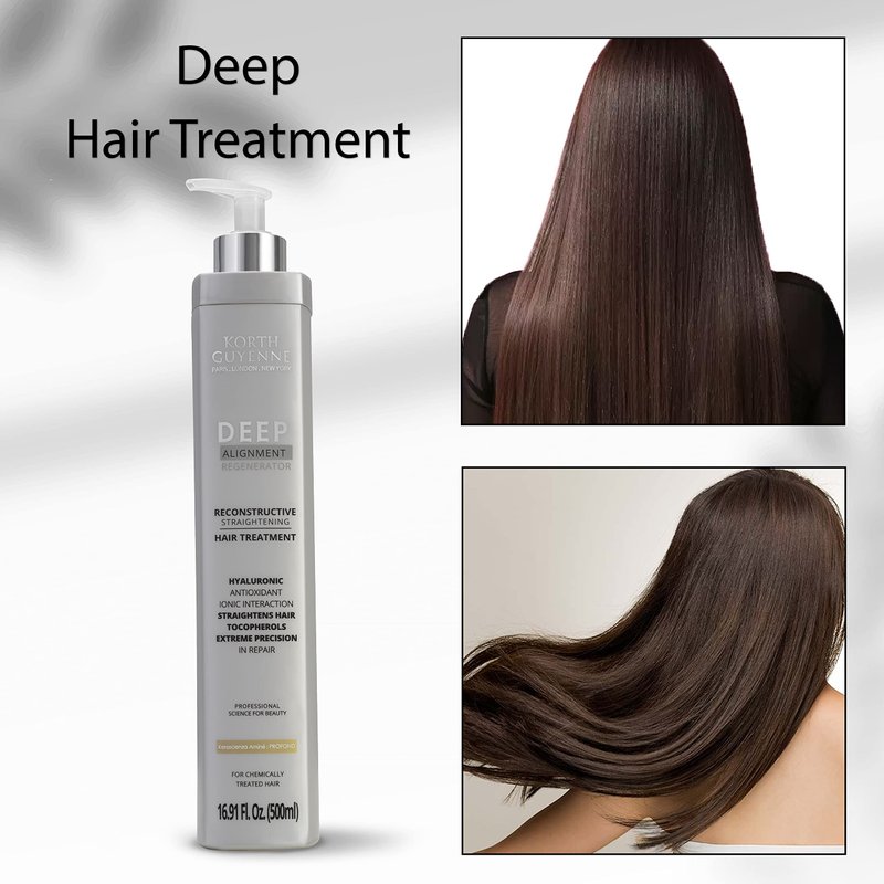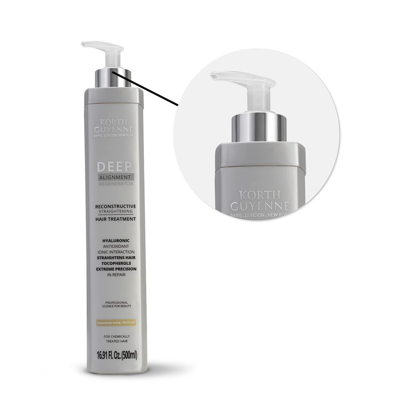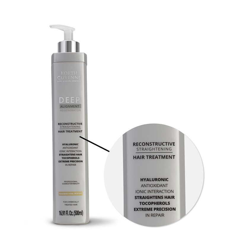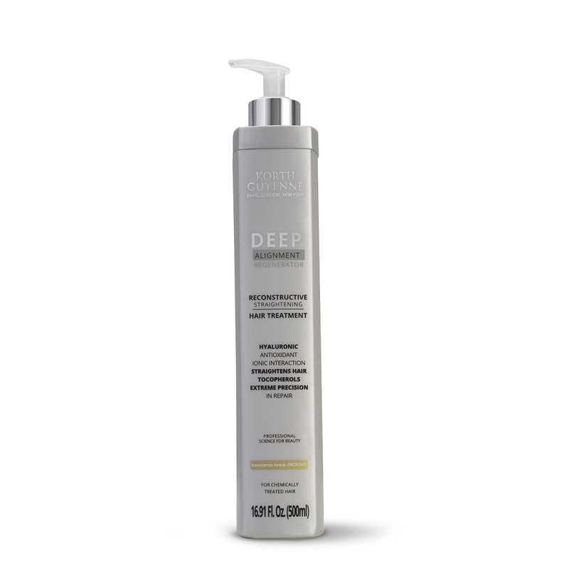 Korth Guyenne Deep Alignment Regenerator System Smoothing Hair Treatment The Korth Guyenne Deep Hair Treatment is an innovative smoothing system that not only reduces volume but also provides deep hydration to your hair. Its unique formula is enriched with nanotechnological and biomimetic amino acids, working together to deeply penetrate the hair fiber, resulting in restoration, nourishment, and intense shine. This Deep Hair Treatment makes use of the advanced Kerascienza Aminé 'PROFOND' technology, which plays a vital role in creating hair proteins, resulting in a smoother hair structure. Moreover, it acts as a guardian for your hair color, preventing fading and ensuring that your look remains vibrant for an extended period. Key Benefits: Reduces volume Deeply moisturizes Restores and nourishes hair intense shine Smooth effect for longer Color protection Application: Wash your hair with a clarifying shampoo and dry it completely. After drying, divide your hair into sections and apply Korth Guyenne Deep Hair Treatment along the entire length. Let it sit for 30 to 60 minutes, then rinse off only the excess product. Following the rinse, use a hair dryer to dry your hair, and finish by running a flat iron through each section 15 to 20 times.. Note: We recommend waiting up to 48 hours before washing your hair after the application. Caution: For external use only. Use the product only for its intended purpose and according to the instructions. We recommend performing a strand test. Do not ingest. Avoid contact with the eyes; in case of eye contact, rinse thoroughly with clean water. If irritation occurs, discontinue use and consult a physician. Do not use the product if you are allergic to any of its ingredients. Keep out of reach of children. Store in a cool, dry place. Do not expose yourself to temperatures exceeding 98°F.