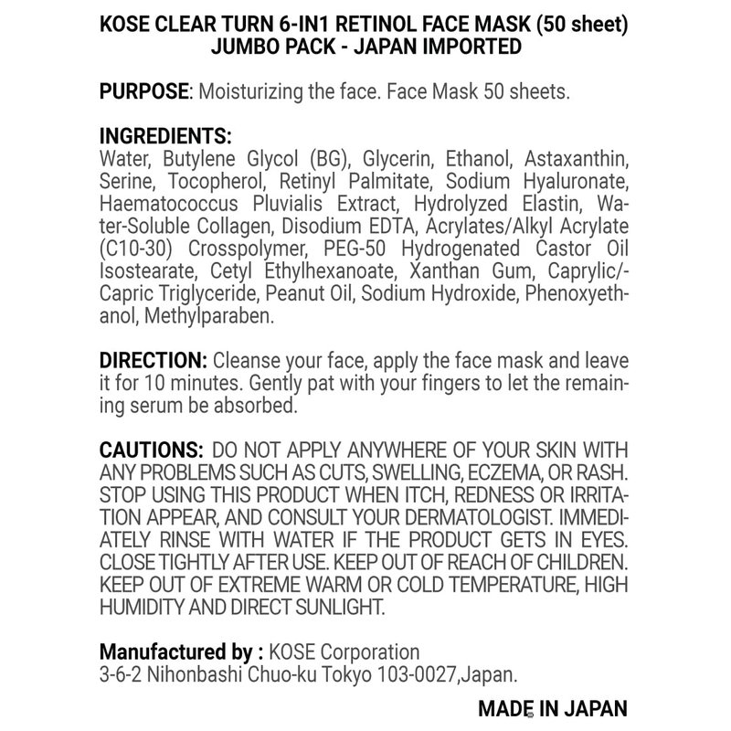 Kose Clear Turn 6-in1 Retinol Face Mask (50 sheet) Jumbo Pack - Japan Imported