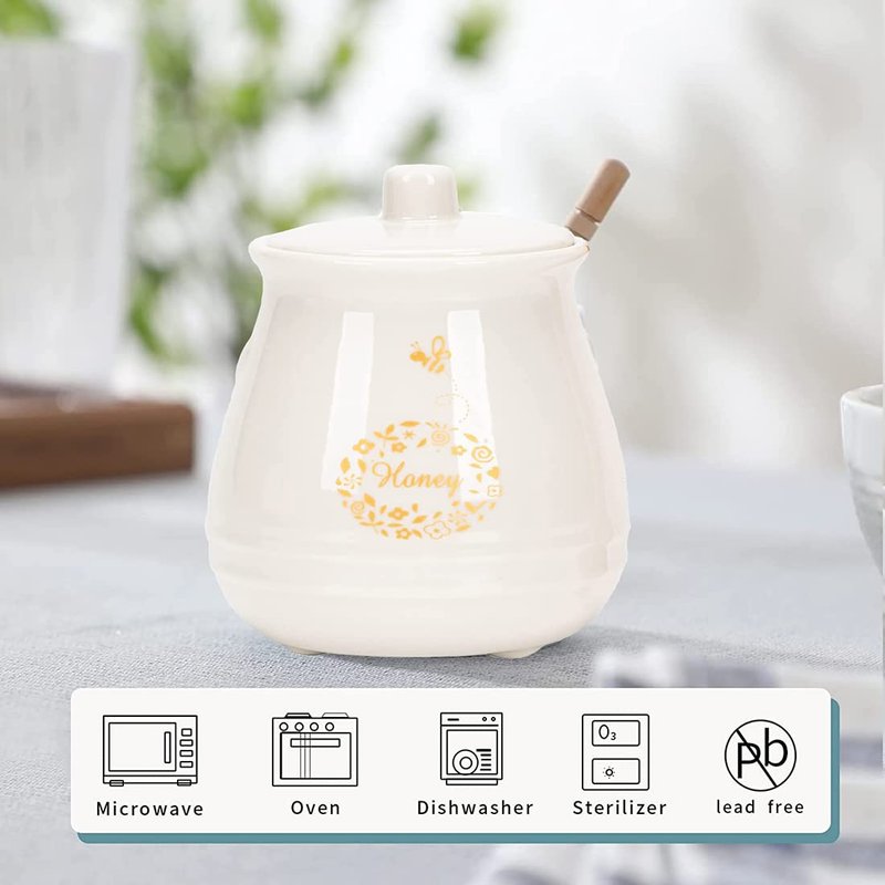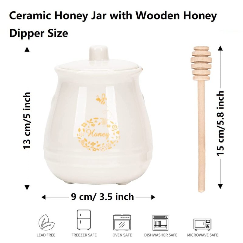 - 【High Quality Ceramic】- Honey Jar with dipper is made of ceramic material without lead and cadmium,it is very easy to clean and good for your health,You can choose to wash it by hand. If you will store there sugar, salt or any other kitchen condiments, please, use wooden spoon with them.