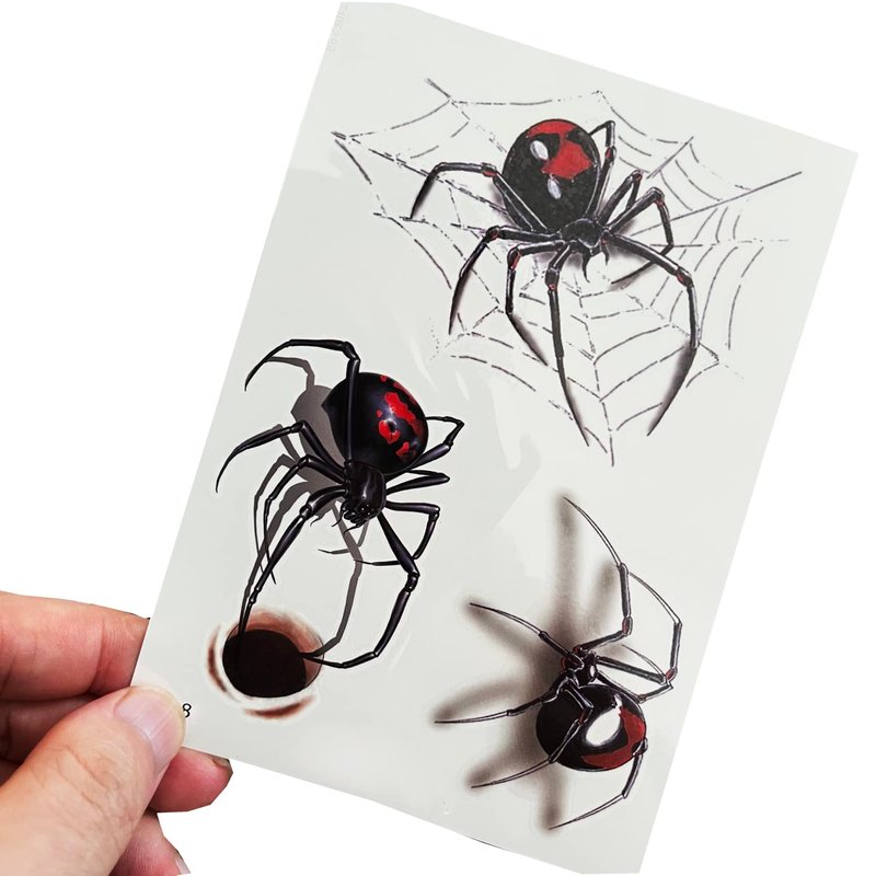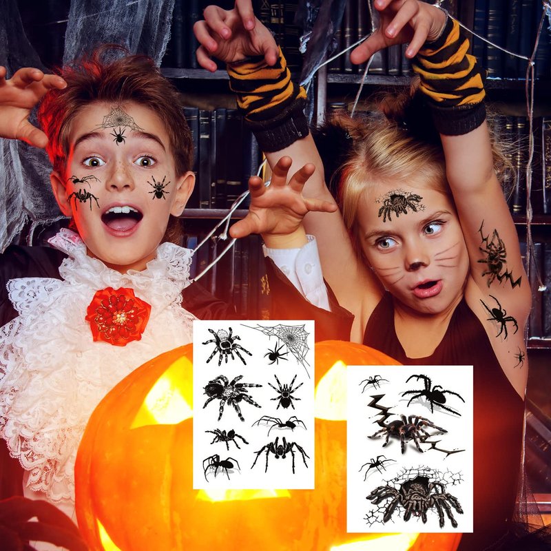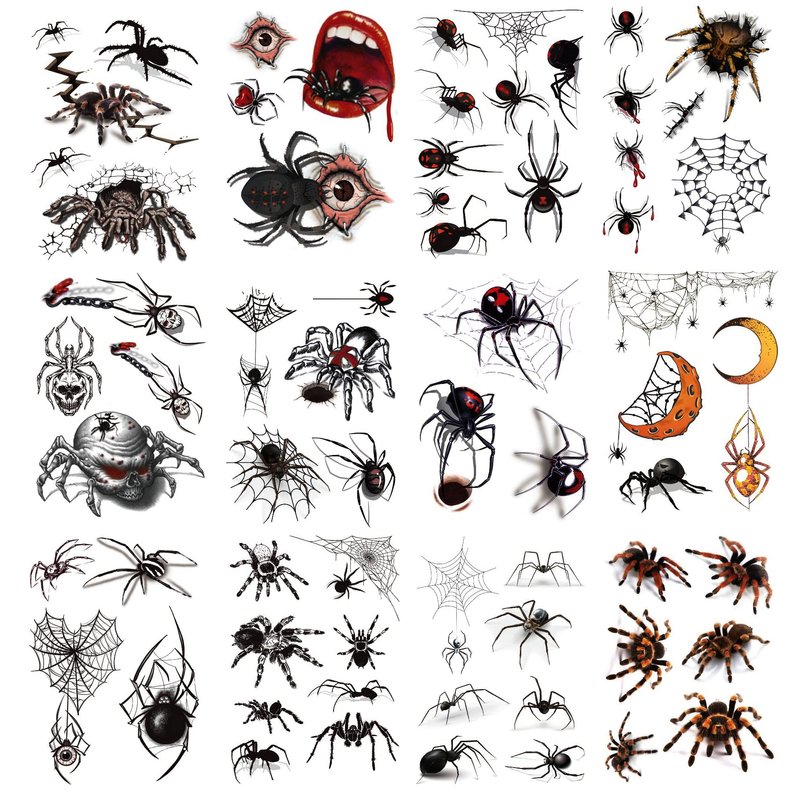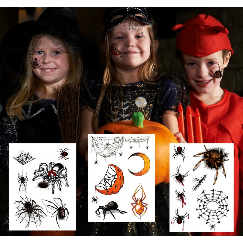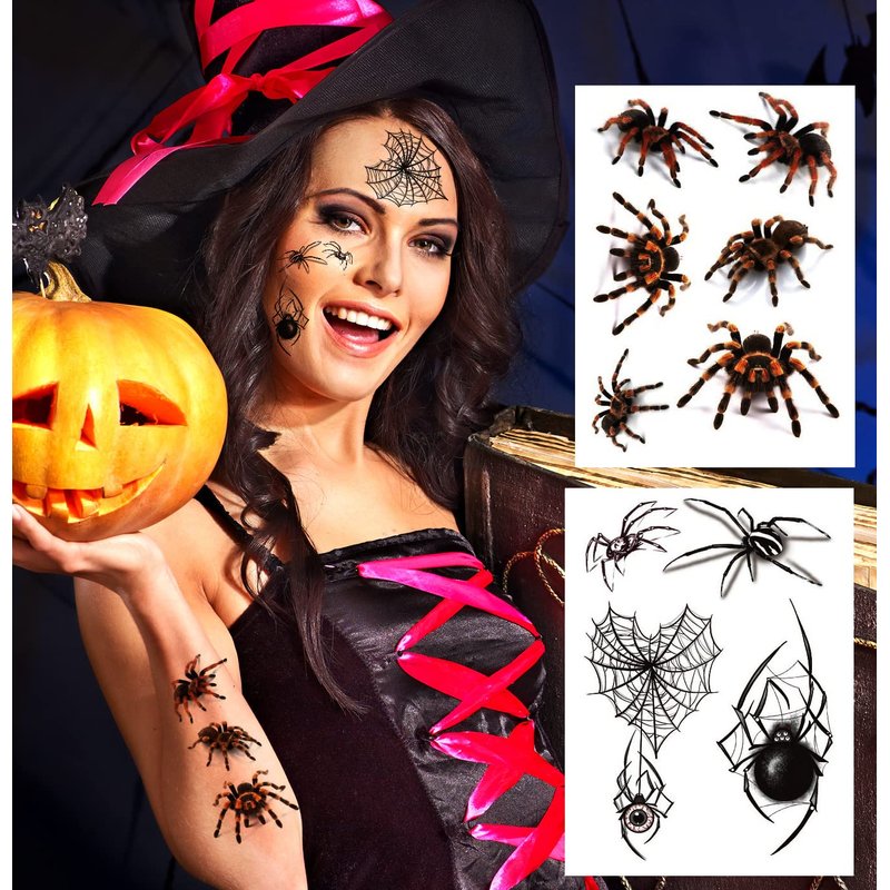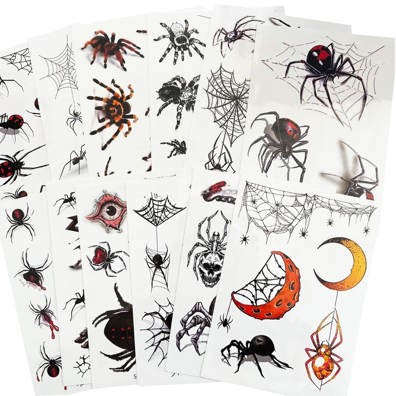 - REALISTIC SPIDER DESIGNS::-- These spider face tattoos feature 12 sheets of detailed and realistic spider designs, perfect for adding a spooky touch to your Halloween costume, witch makeup, festivals, and parties. The designs include various types of spiders and cobweb patterns, making them ideal for creating a creepy look. Each sheet measures 4.0 x 5.8 inches.