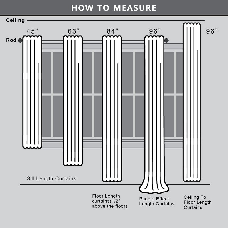 - PACKAGE & EASY CARE: Sold as 2 curtain panels. Dual pockets.1 inch header pocket for ruffle effect and 2.5 inch pocket large enough for decorative curtain rods.Each panel measures 45 Inch height x 42 inch width.Total width is 84 inch width.Machine wash cold.No bleach.Tumble dry.Cool iron if needed.