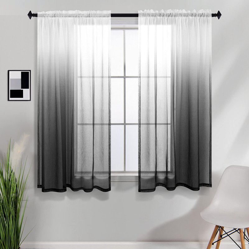 KOUFALL Bathroom Window Curtains for Shower Set of 2 Panels Black and White Sheer Ombre Short Curtains for Kitchen Bedroom Small Windows, 42 x 45 Inch Length