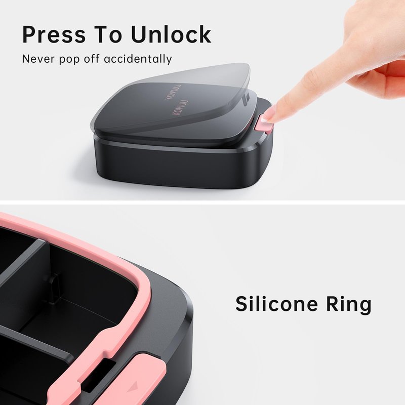 - 💘Snap-lock Opening Design.You can achieve one-handed operation for the smart "lid spring open" with the latest design on this cute small pill case.The push to unlock prevents the compact pill case from accidentally opening in your purse. They're easy to open but the lid won't open highly to protect the pills better.