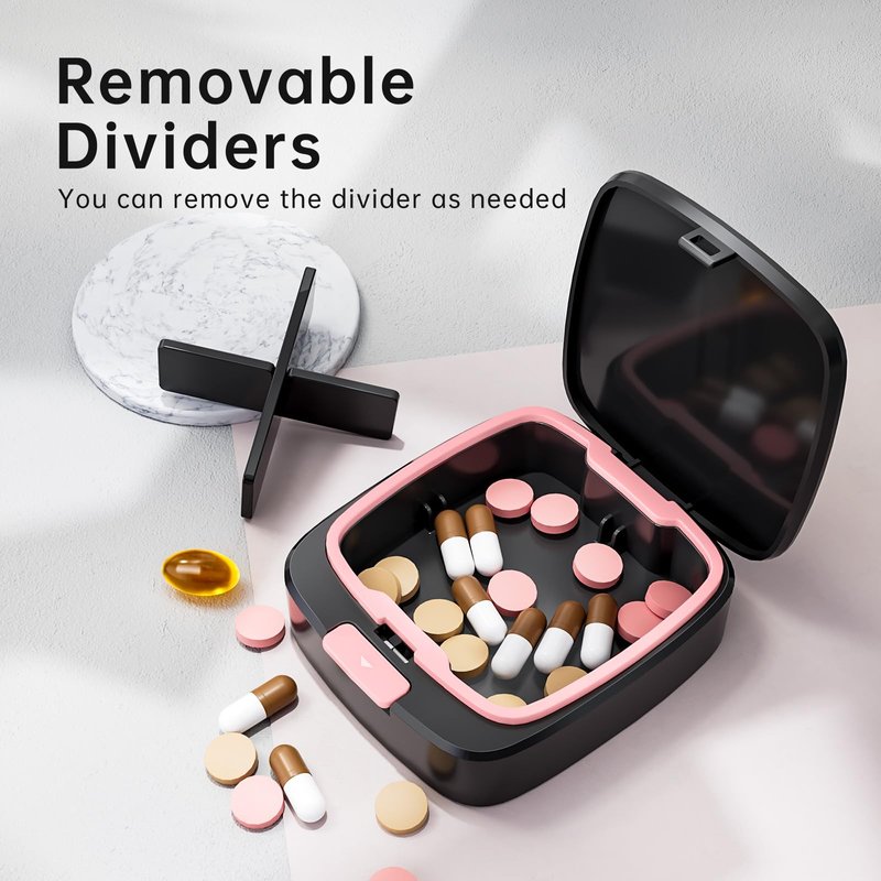- 💓2 Removable Dividers. KOVIUU travel pill box can hold maximum up to 32 fish oils or 40 large vitamins. Each travel pill organizer for purse has 2 removable dividers for twice or four times a day medication needs. This small pill organizer for purse has a unique high quality silicone ring inside. Compared to other travel pill cases, its excellent moisture resistant design will protect your pills more safely and keep them sealed.