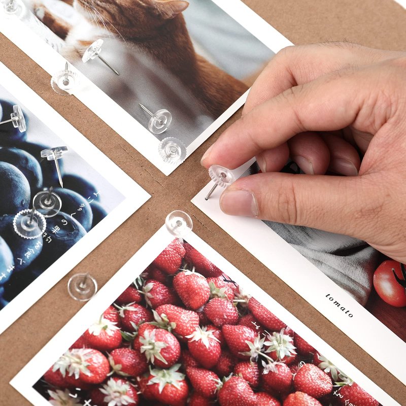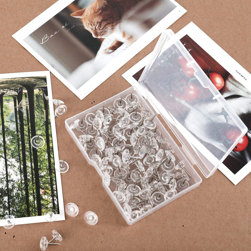 Specification: Material: plastic and steel Color: clear Size: The clear metal needle: 1.6 cm/0.63 inch in length The plastic gear head: 1.1 cm/0.43 inch in diameter Package includes: 100 /Clear Push Pins& Clear Gear Push Pins Warm notes: 1. The product is sharp and small, please keep children away; 2. Not suitable for concrete wall and ceramic wall. Used these for postcards/photos, not through the corners but around them to pin them to the wall. Works great and doesn't bend, easy to put in and remove.