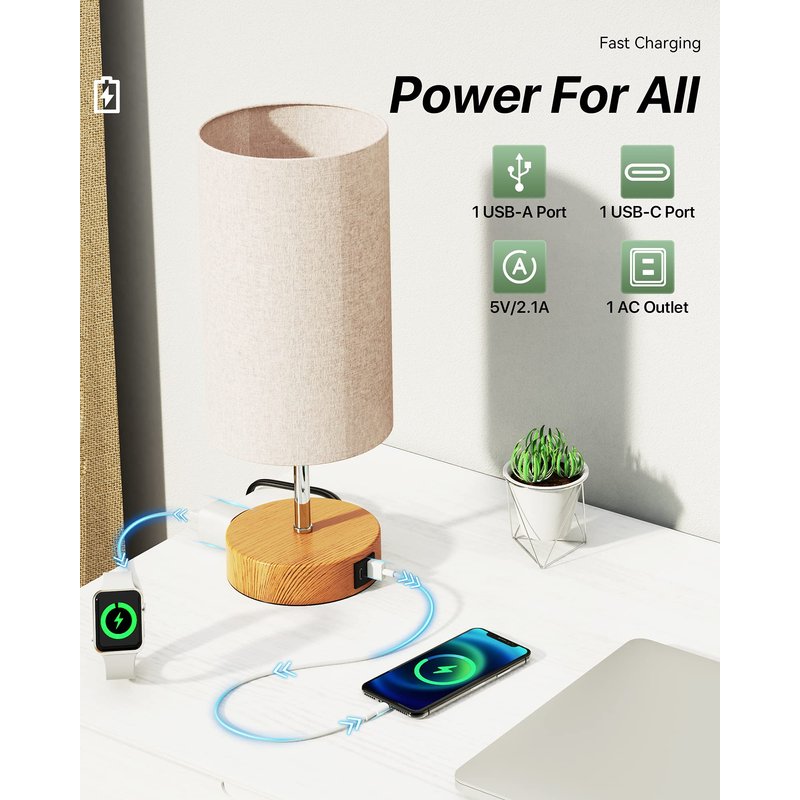 - ❤️【USB A+C charging Ports & AC Outlet】―Besides illumination, this modern table lamp for bedroom is euipped with USB A &USB C (5V/2.1A), and AC outlet (120V) for fast charging, getting your phones, tablets, humidifier, kindle, headsets, speaker and other electronics fully charged no matter if the side table lamp is on or off.