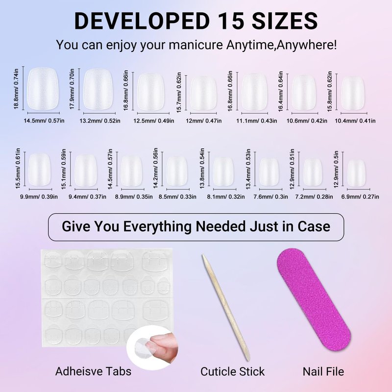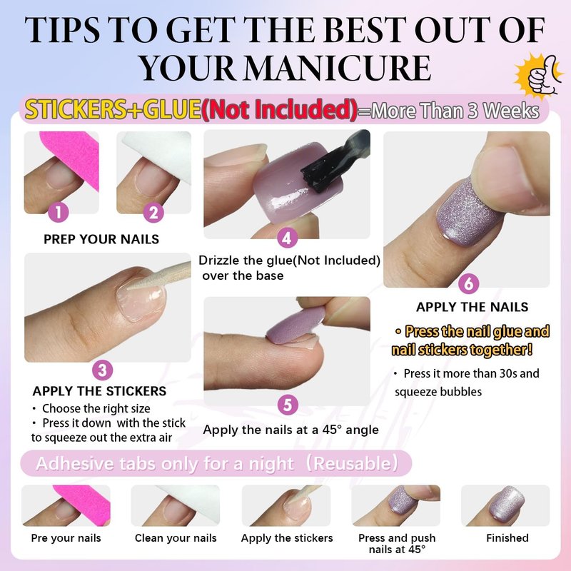 2.Please note that the nail glue is not included.If you want it last for a longer time,please use nail glue instead of the nail stickers.<br>