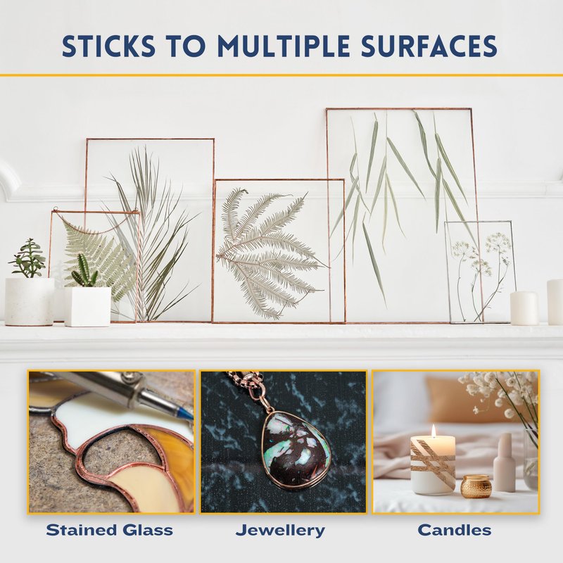 - Stained Glass Framing: Solder doesn't stick to glass so use our copper foil tape for stained glass, it's the perfect copper tape for soldering those edge and surfaces for a good looking and practical finish