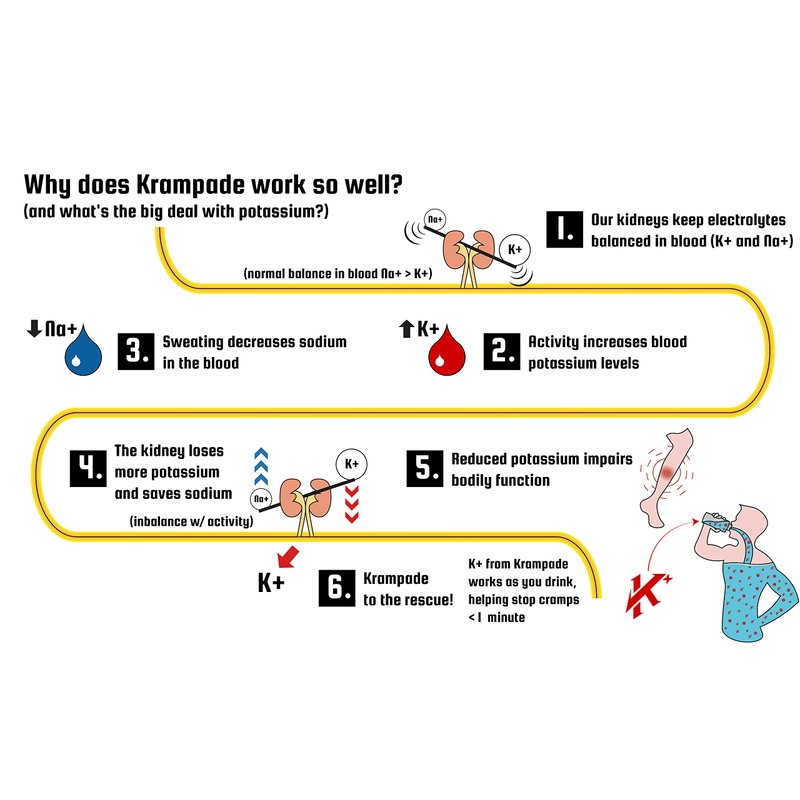 Imagine a world where a cramp can be resolved in an instant, and an athlete can push themselves to their limit without the fear of a new cramp coming on. The world exists today, with Krampade 4K. Krampade 4K contains 4000 mg of potassium per serving and is specifically designed for instant cramp relief. It is salty but the 4K works exceedingly well, especially for stopping acute, active cramps. Originally created by our CEO, Dr. Eric Murphy, for his son’s wrestling woes, the 4K had to work to stop active whole-body cramps and allow for continuation of wrestling without further intervention. This means that whole-body exercise associated muscle cramps had to be stopped in under 60 seconds without fear of recramping later. Not only did Krampade 4K stop the cramps, but it also rejuvenated his strength and added stamina for the match. This cutting-edge technology led to a huge number of wins and propelled his son to wrestle at a top-end division 1 wrestling program. All cramps have the same physiology. Not enough potassium is left in the muscle to repolarize the cell and the muscle is left in the contracted state and cannot be controlled, aka a cramp. If it cramps, Krampade 4K is your instant cramping solution for: Athletic cramps, Nighttime leg cramps, Heat cramps, Charlie horses, and Menstrual cramps. Don’t let painful cramps keep you from enjoying your daily activities. Krampade 4K is the proven, reliable, and easy way to stopping painful cramps of all kinds in their tracks and keeping them away.