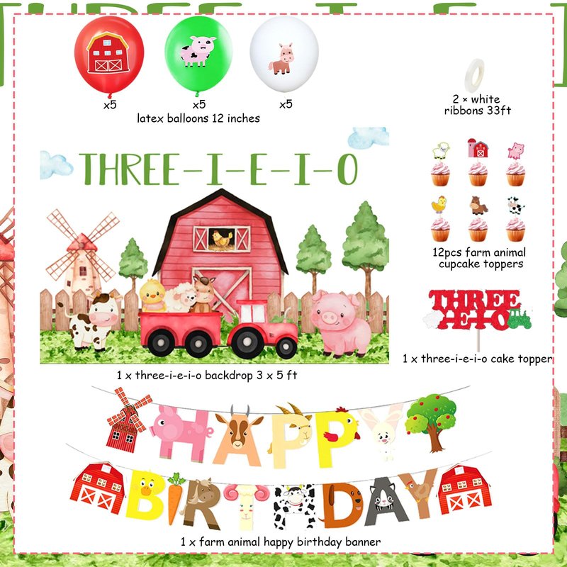 - Package Includes: The farm 3rd birthday decorations include 15 x latex balloons 12 inches, 1 x farm animal happy birthday banner, 1 x three-i-e-i-o backdrop 3 x 5 ft, 1 x three-i-e-i-o cake topper, 12pcs farm animal cupcake toppers, one pack can meet your various needs for farm 3rd birthday party