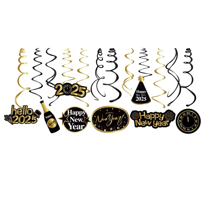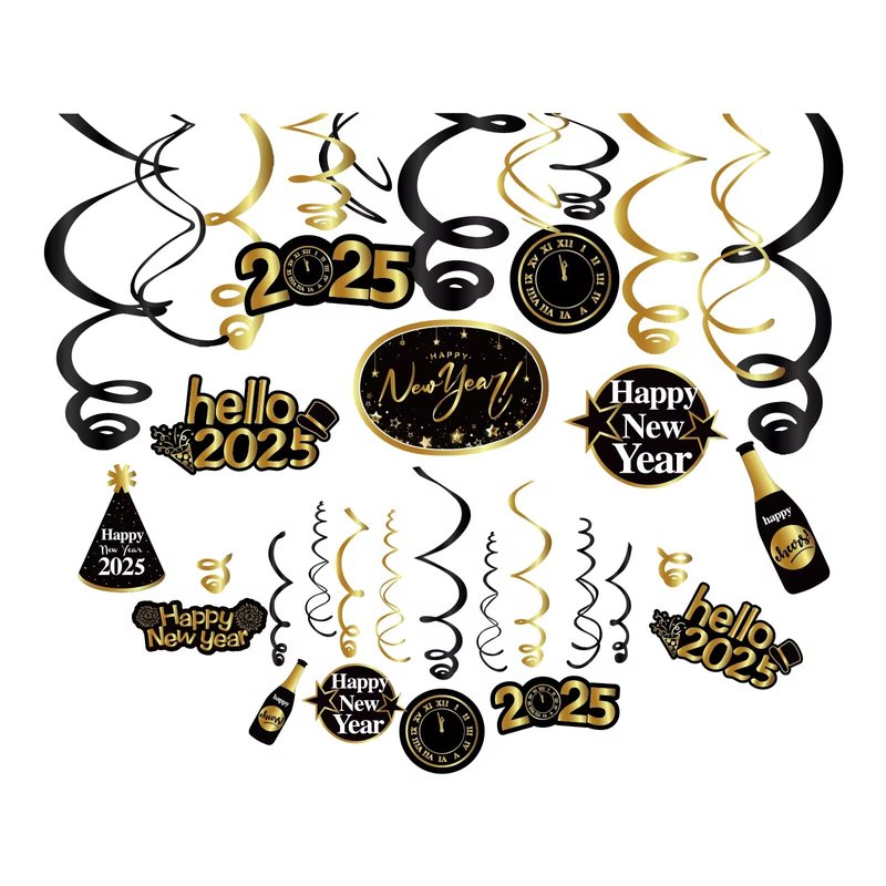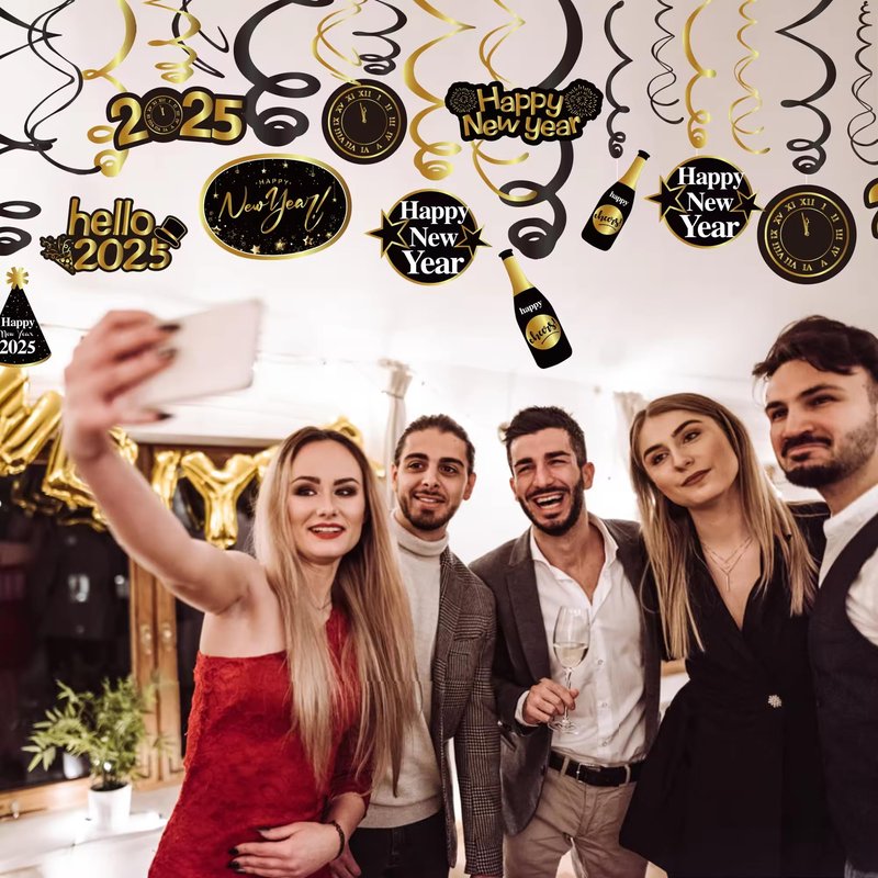 Kristin Paradise 30Ct Happy New Years Eve Hanging Swirl Decorations, 2025 NYE Glitter Gold Black Decor, NY Theme Party Supplies Pack, Eve-Nye Party Favors for Adult, Foil Home Decorating Kit