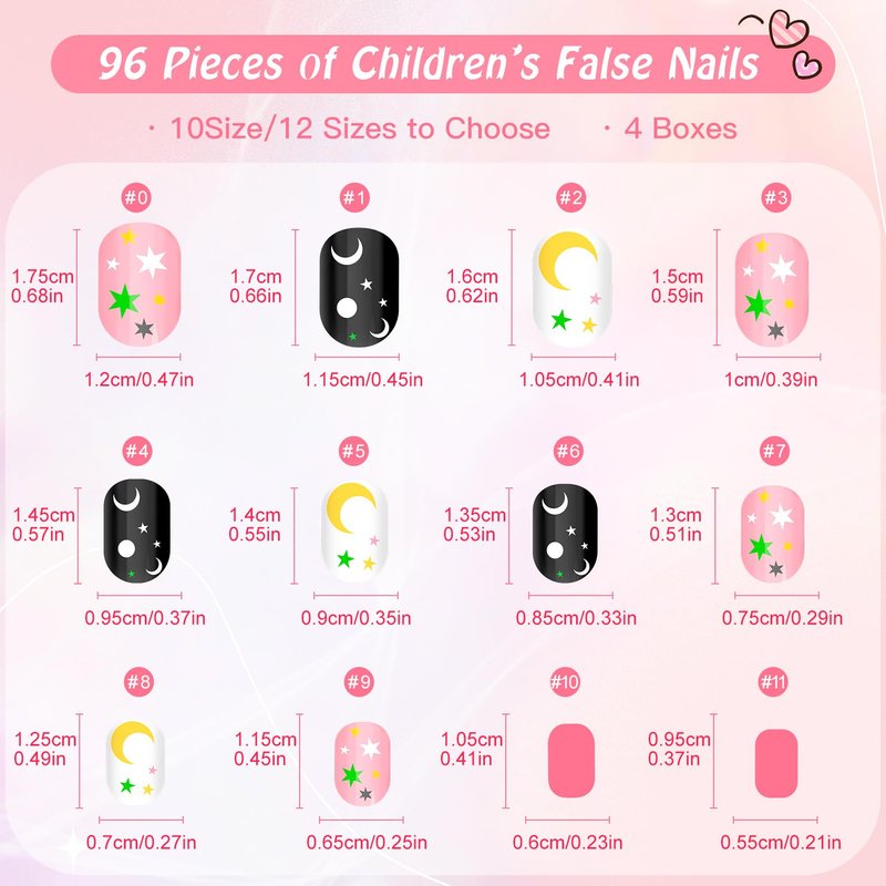 - 【Different Sizes and Safety Material】: There are 96 pieces of children fake nails kit, each with 12 sizes, which is convenient to choose the suitable size that fits kids' finger. Press on nails for kids are designed for children,made of acrylic material. Children fake nails lightweight and breathable,no harm to children's fingernails and skin, reusable.