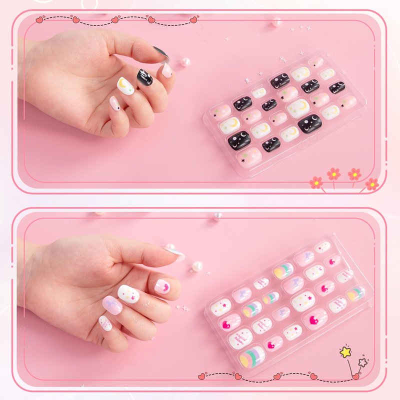 - 【Easy to Use and Remove】: Acrylic fake fingernails kits sets are easy to use, just choose the right children fake nails size that suits your nails, and press for 10 seconds to get beautiful nails; If you want to remove children fake nails, just soak in warm water for 10-15 minutes, gently twist kid press on nails, you can easily remove stick on nails for kids;