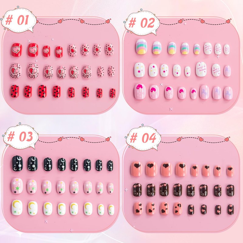 - 【Kids Nails Presents】Kids press on nails design has a variety of cute patterns and bright colors. In children's day or campus activities, children fake nails are very good decorations; Kids press on nails are a present for Thanksgiving, Christmas, New Year's Day, parties, birthdays and other occasions.