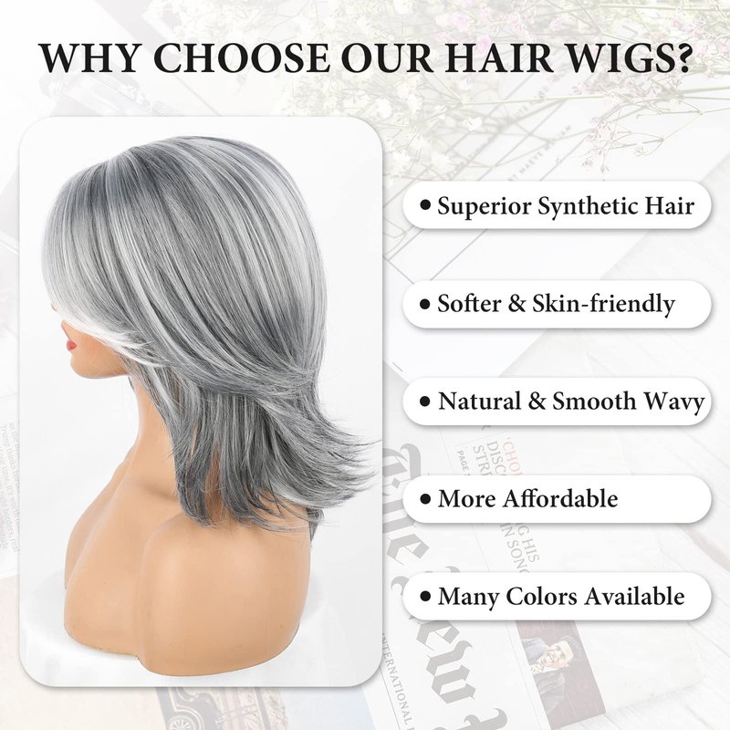 - 🌹1. 【Wig with Bangs Material】 Short wavy silver grey layered wig with bangs for women is made of realistic heat-resistant synthetic fibers. It's soft lightweight and easy to manage, little hair loss and tangle free which can use for a long time, giving you a more charming natural looking.
