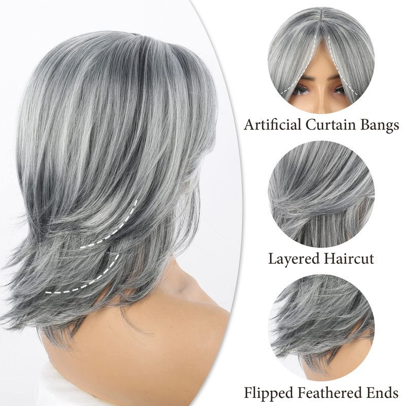 KRSI Grey Layered Wig Mix Gray and Black Natural Wave Hair Wigs for Women Shoulder Length Silver Wavy Wigs with Curtain Bangs Wigs 14inch Short Layered Gray Wig Short Synthetic Wigs for Black Women