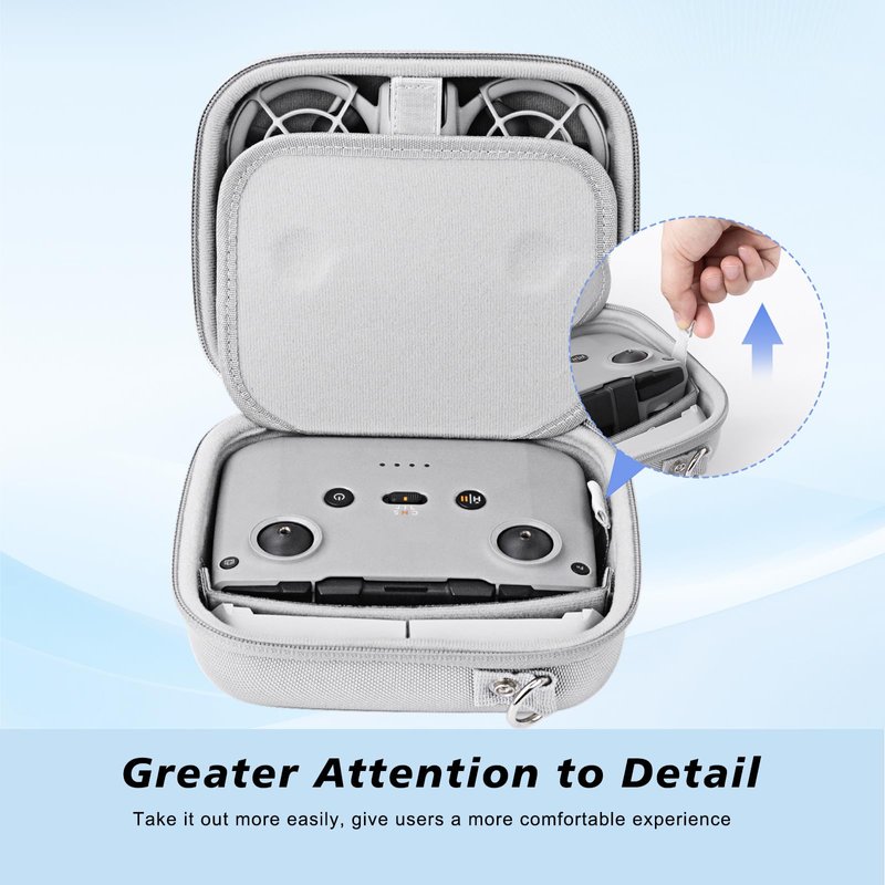 - Large Compatibility: Find a home for messy accessories, and protect your neo drone! The neo case is lightweight and perfectly keep everything neatly in place, offers perfect fitting space for dji neo drone, dji RC-N3/N2 remote controller, 3 x intelligent flight battery (one can install in the drone), spare propellers, type-c to type-c pd cable, screwdriver, spare propeller screw, rc cable (sub-c connector), power adapter, control joysticks and other accessories