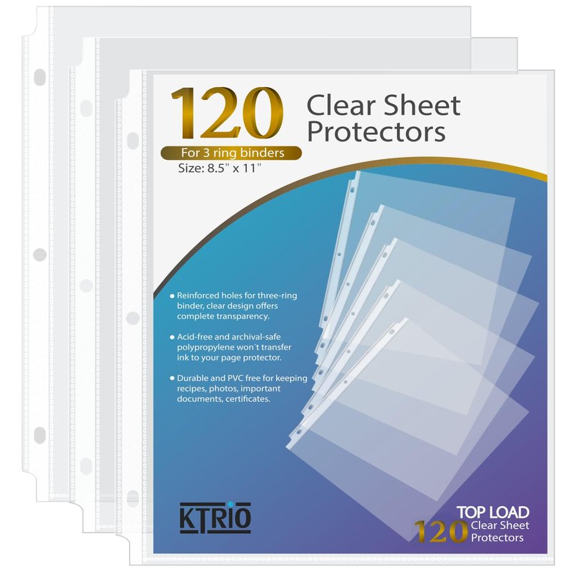 KTRIO Clear Sheet Protectors. Name: Ktrio clear sheet protector. Package: 120 pack clear sheet protector. Measure: 8.5 x 11 inches, letter size. Material: polypropylene. Special Feature: Easy-access top loading opening allows you to quickly add and take out documents without having to open up the rings of your binder. Clear plastic page protectors keep documents clean. Fit for any standard 3 ring binder without punching holes and damaging the inserted materials. The paper protector is ideal for keeping recipes, photos, important documents, and certificates. Customer Service: Within 24 Hours Instant Respond. Any quality issues, please feel free to contact us.