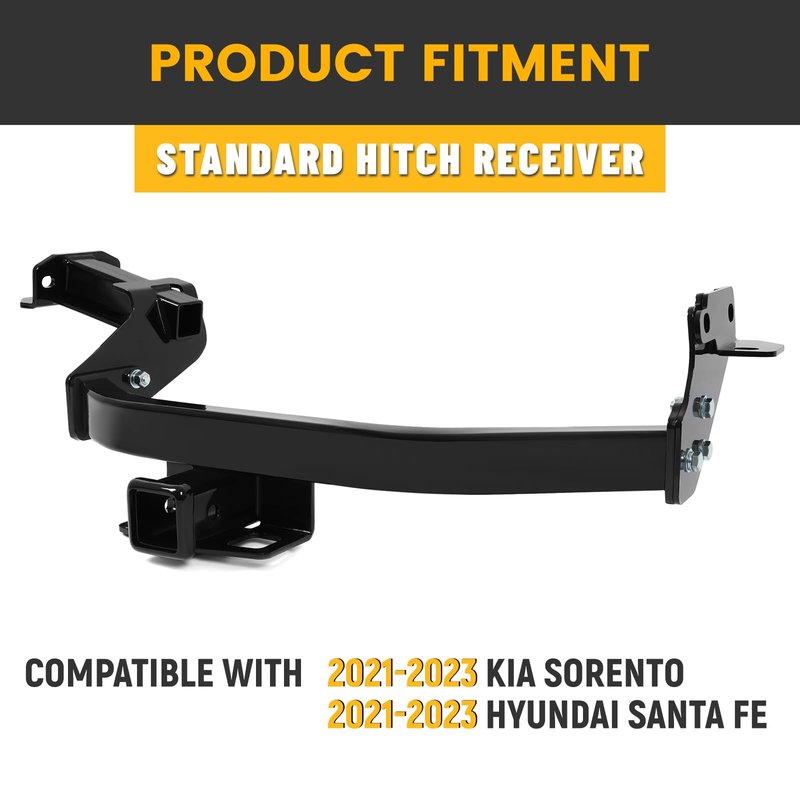 Compatibility: Compatible with 2021-2023 Kia Sorento; Compatible with 2021-2023 Hyundai Santa Fe. This trailer hitch is rated for 4,000 lbs. gross trailer weight and 600 lbs. tongue weight. Sturdy Material: Made of durable steel, it is not easy to deform and break when facing heavy loads. The surface is black powder coated to prevent rust and reliable weather resistance extends the using life. Upgraded Function: Accept all 2 inch hitch accessories allowing for a variety of towing options. Expand loading and transportation capacity and improve convenience; reduce travel burden and provide a relaxing travel experience. Package: 1 x 2-Inch Class 3 Trailer Hitch Receiver with mounting accessories and Installation instruction. Installation: Installed with screws, the installation is simple and you can complete it quickly.