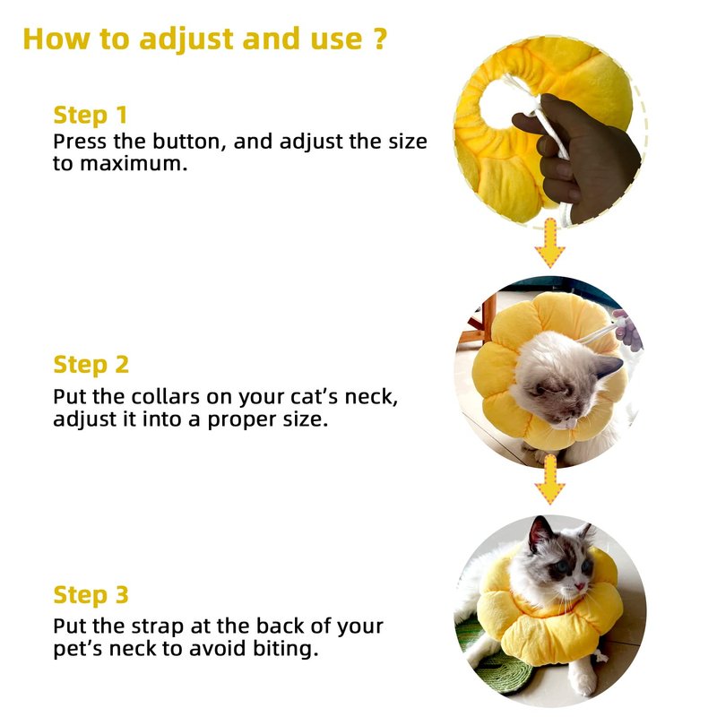 KUDES Cute Adjustable Neck Cone for Your Lovely Kitten. Not only preventing pet from aggravating a healing wound or injury, also can add more fun and laughter to your cat and your family during its recovery time. NOTE: Please measure your pet’s head size before purchase. How to properly measure your pet's size? To find the right size collar for your pets, you will need to take 2 measurements: 1) Soothing your pets 2) Measure the head circumference, assuring that you pets’ head could go through the cone Features: 1.Unique sunflower shape recovery collar, makes your cat look very cute and fun. 2.Made of high quality and light PP cotton. Durable, soft and comfortable, ensures the pet wearing experience, it won't irritate pets skin. 3.After surgery, cats like to lick the wound, cat cone can keep your cat from licking the wound, speed up wound healing. 4.Avoid your pets overreaction (bite,struggle,stressful transition) when grooming,bathing and injection. Occasion: -The small pet cone is suitable for small pets like small dog, cats, rabbits and other small pets. -The pet E-Cone can protect your pets from scratch the wound after surgery. And also the collar can also be pet costumes donut/ cone of shame costume on holidays. Package Included: 1 x Cat Recovery Collar. Warm Tips: Your cat can still lick their front and back paws with wearing this cone. Only useful for wounds on the upper part their body. Please confirm the position of your lovely pet's wound before placing the order.
