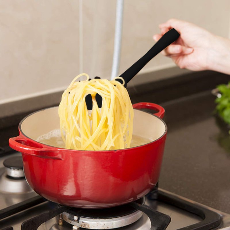- 2. Comfortable grip and easy storage: The handle of our spaghetti spoon is smooth and soft, providing a comfortable grip. It also has a large hanging hook for easy storage. Made from silicone material.