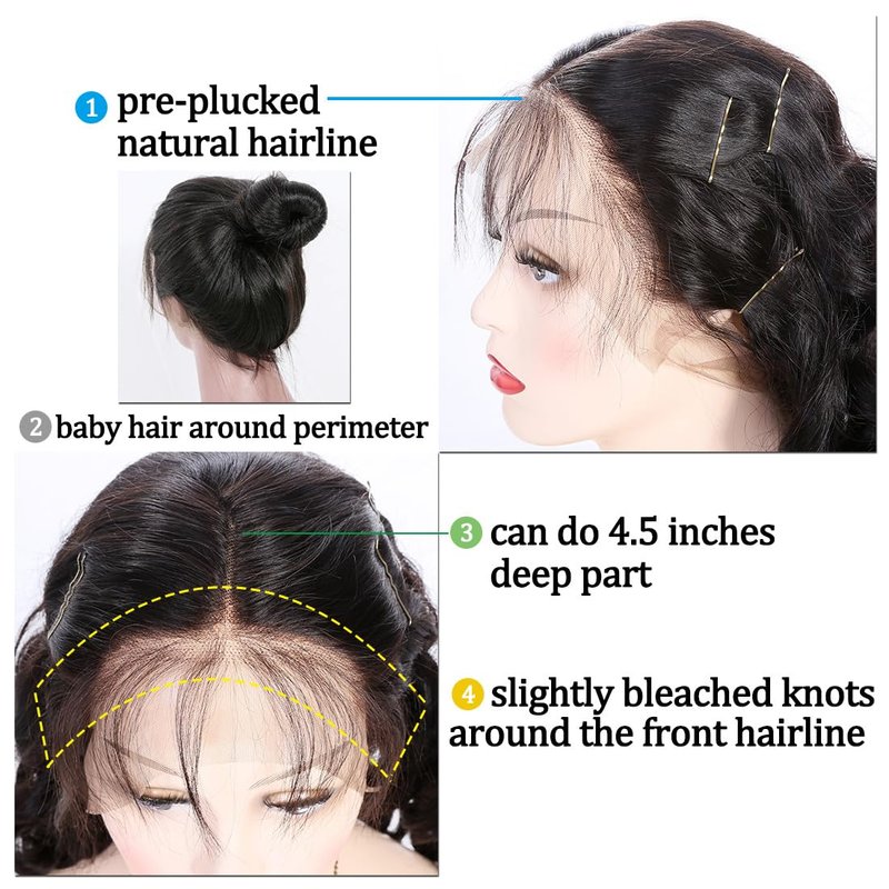 - KUN Hair 360 Human Hair Body Wave Wig Lace Size: 360 Large Lace Area, Front 4.5 Inches Deep Lace Size, Support Middle Deep Part and Side Part, Invisible Bleached Knots Match All Skin Color Well. Looks More Natural When Take It On, Breathable & Durable Swiss Lace Material Make it More Comfortable. You Can Wear This 360 Lace Frontal Body Wave Human Hair Wigs in All Occasions.